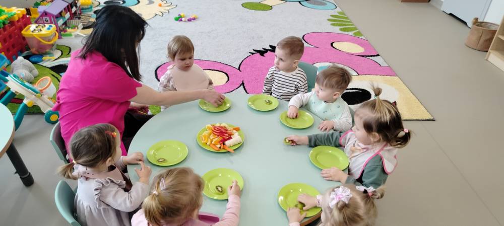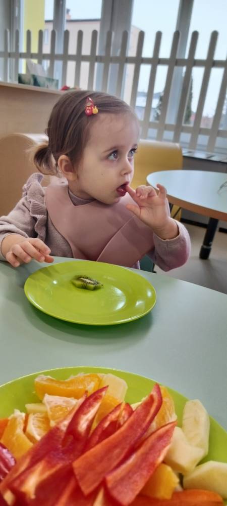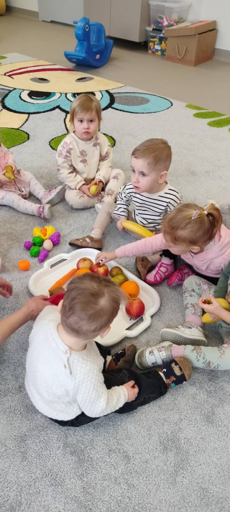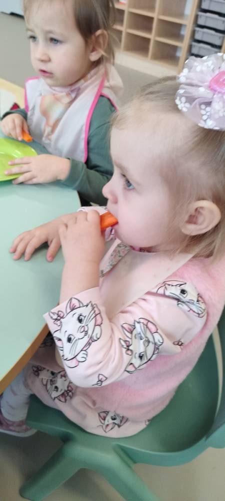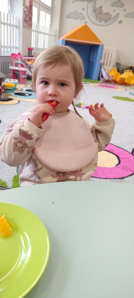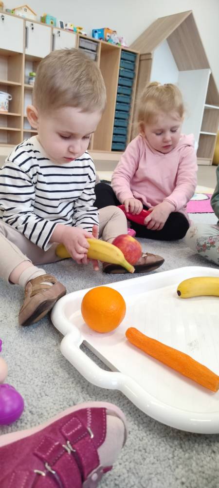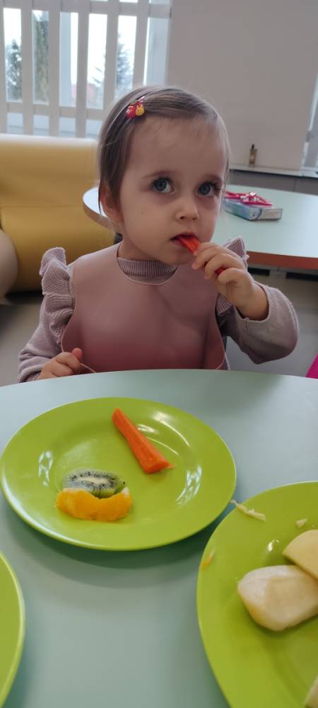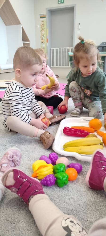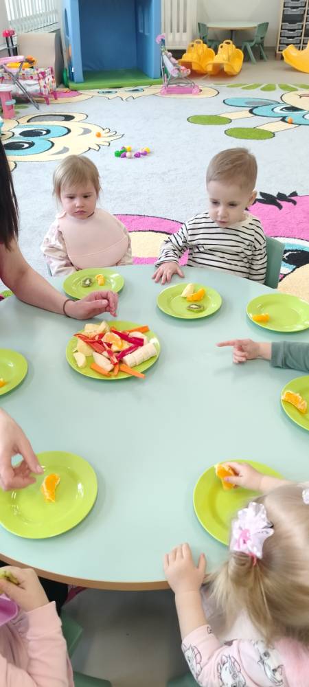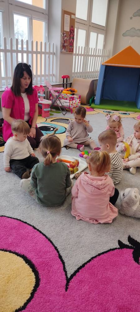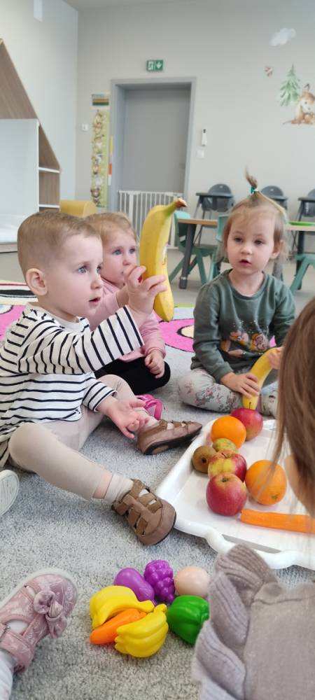 Do żłobka przyszła Pani pielęgniarka, aby opowiedzieć dzieciom o zdrowych nawykach i o tym, jak ważne jest jedzenie owoców i warzyw. Maluszki z zainteresowaniem oglądały kolorowe jabłka, banany, marchewki , paprykę, gruszkę,kiwi i pomarańcze. Pani tłumaczyła, że dzięki nim dzieci rosną zdrowe i silne. Następnie Pani dokładnie umyła wszystkie owoce i warzywa, obrała je i pokroiła na małe kawałeczki. Każdemu dziecku podawała do spróbowania owoce i warzywa, zachęcając do poznawania nowych smaków. Dzieci chętnie próbowały, a na ich twarzach pojawiły się uśmiechy. To był zdrowy i radosny dzień w naszym żłobku. 🍎🥕