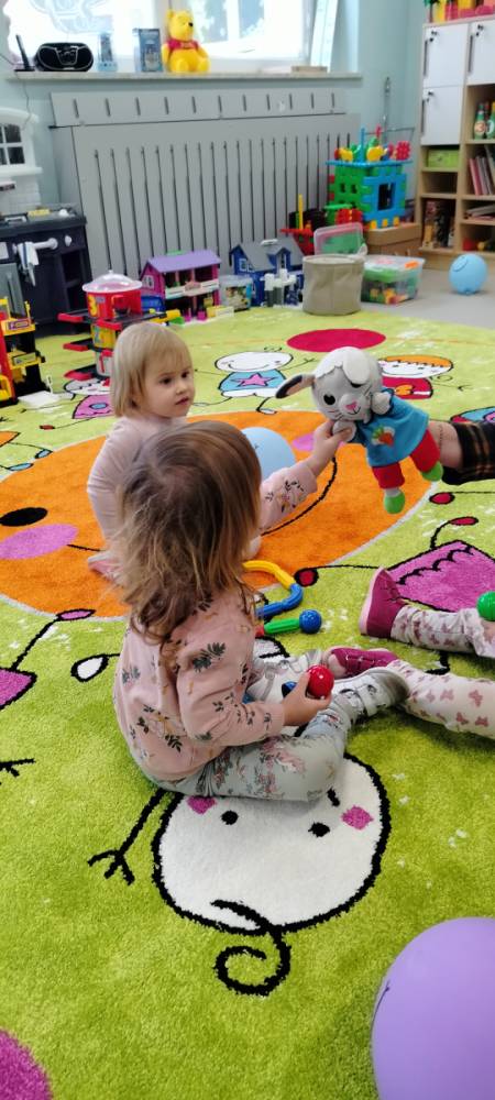 Po angielskim przyszedł czas na zajęcia sensoryczne. Dzieci dotykały różnych faktur – miękkich, szorstkich i gładkich, delikatnie drapały paluszkami powierzchnie i odkrywały świat przez zmysł dotyku. Królik Dasty wszystkiemu przyglądał się z ciekawością i bawił się razem z nami.