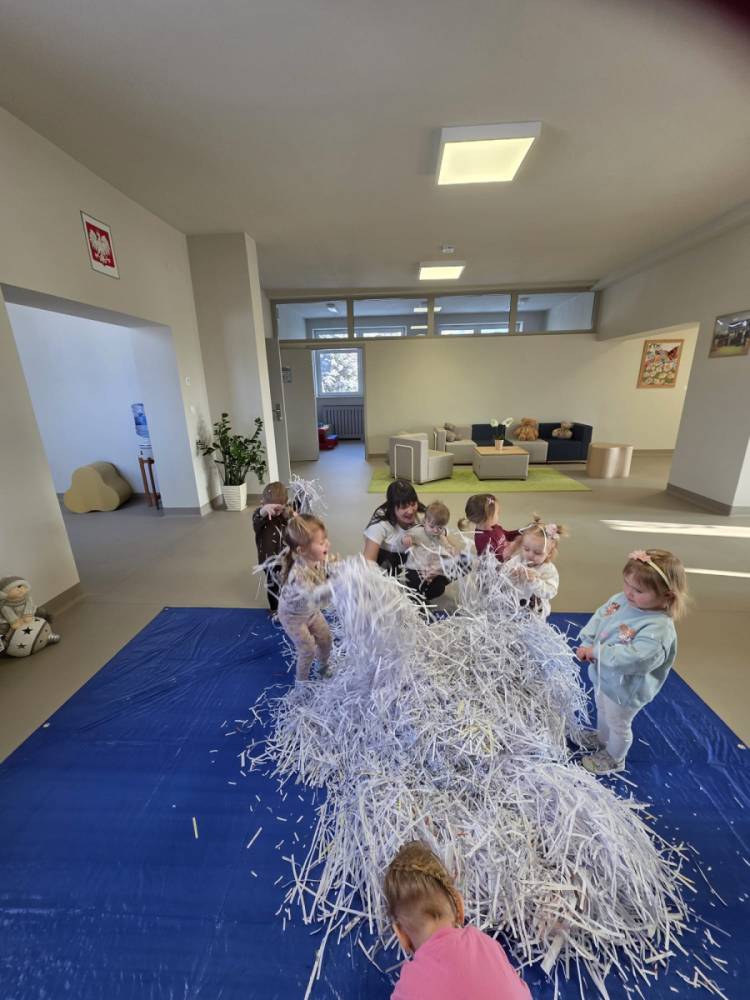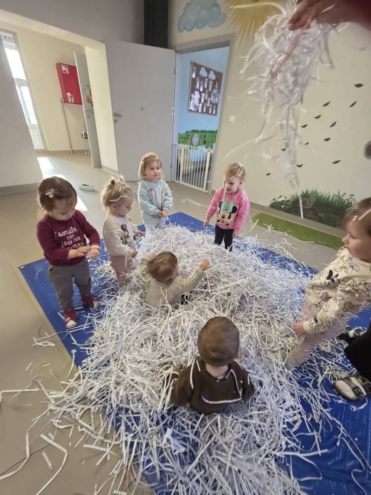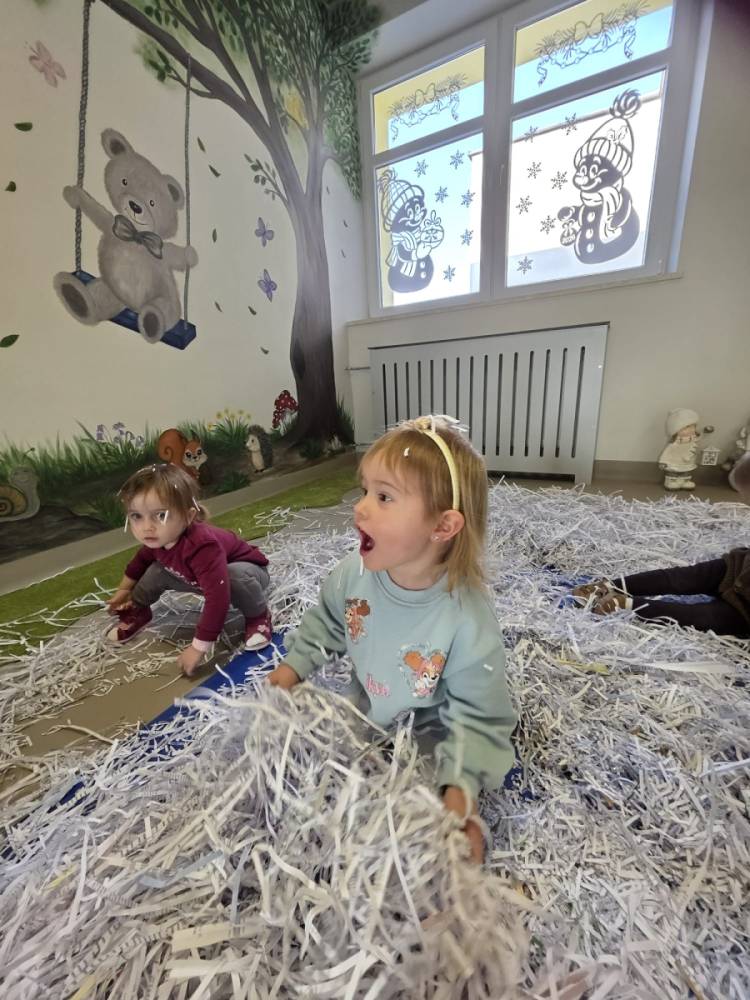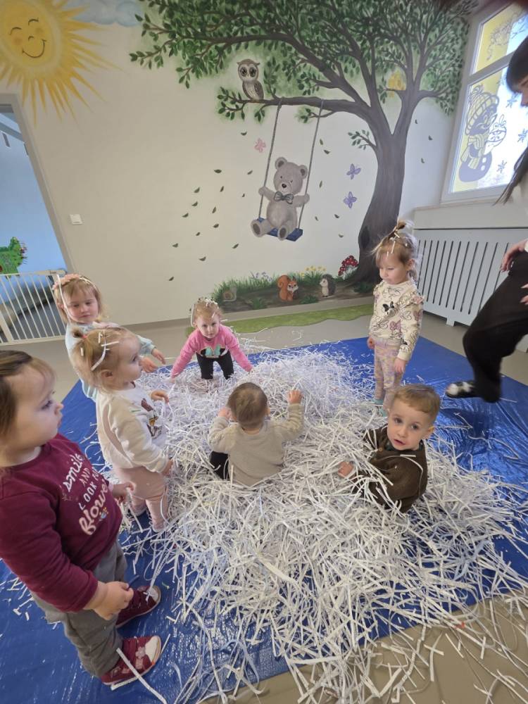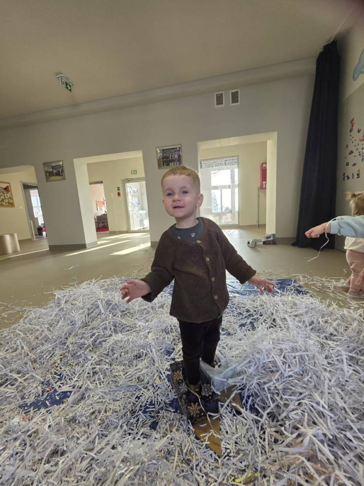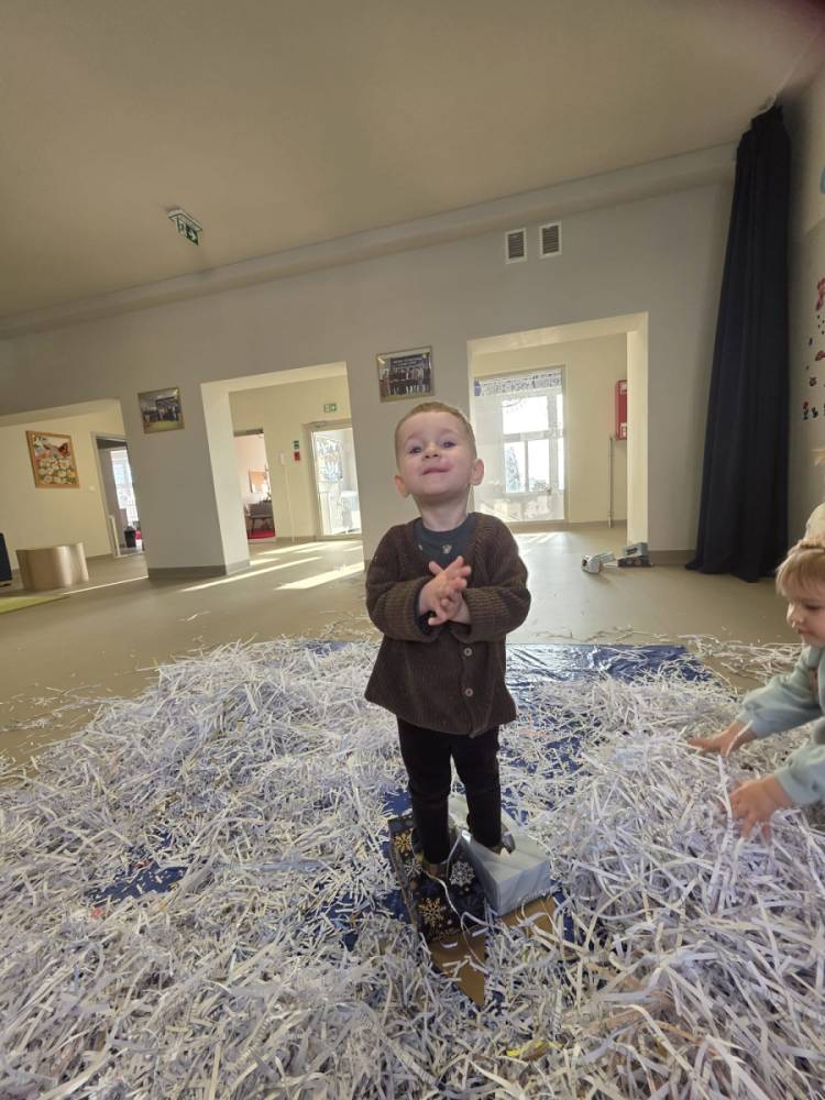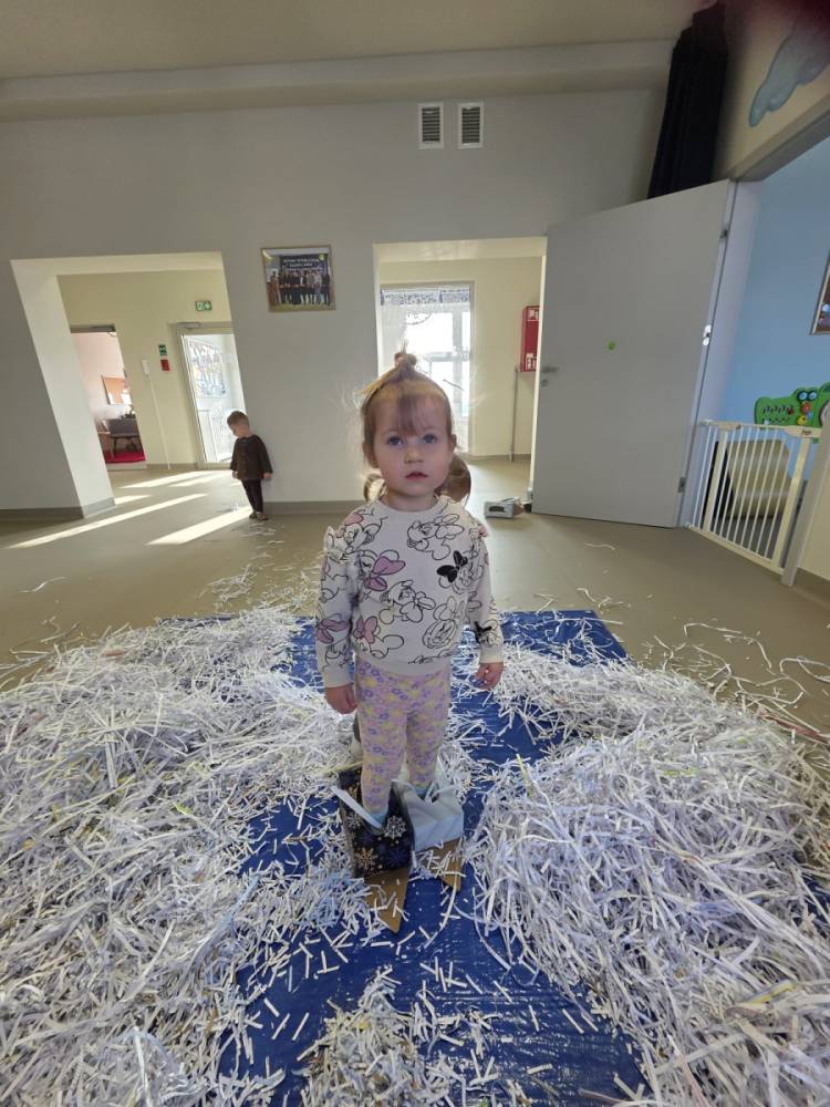 Zima w naszym żłobku trwa w najlepsze! ❄️☃️ Dziś nasze maluchy wybrały się na salę z własnoręcznie przygotowanymi nartami 🎿 – wykonanymi z pudełek po chusteczkach higienicznych i papieru z drukarki. Wystarczyła odrobina wyobraźni, by zwykła sala zamieniła się w prawdziwy, zimowy stok! Dzieci ćwiczyły równowagę, maszerowały dumnie w swoich „nartach” i nie szczędziły uśmiechów. Było dużo śmiechu, ruchu i kreatywnej zabawy. 💙