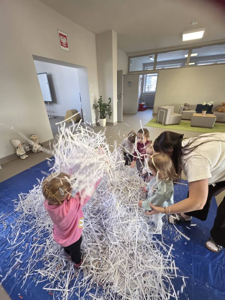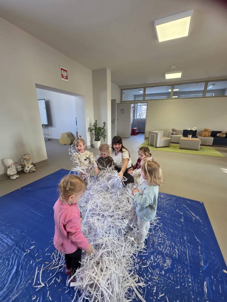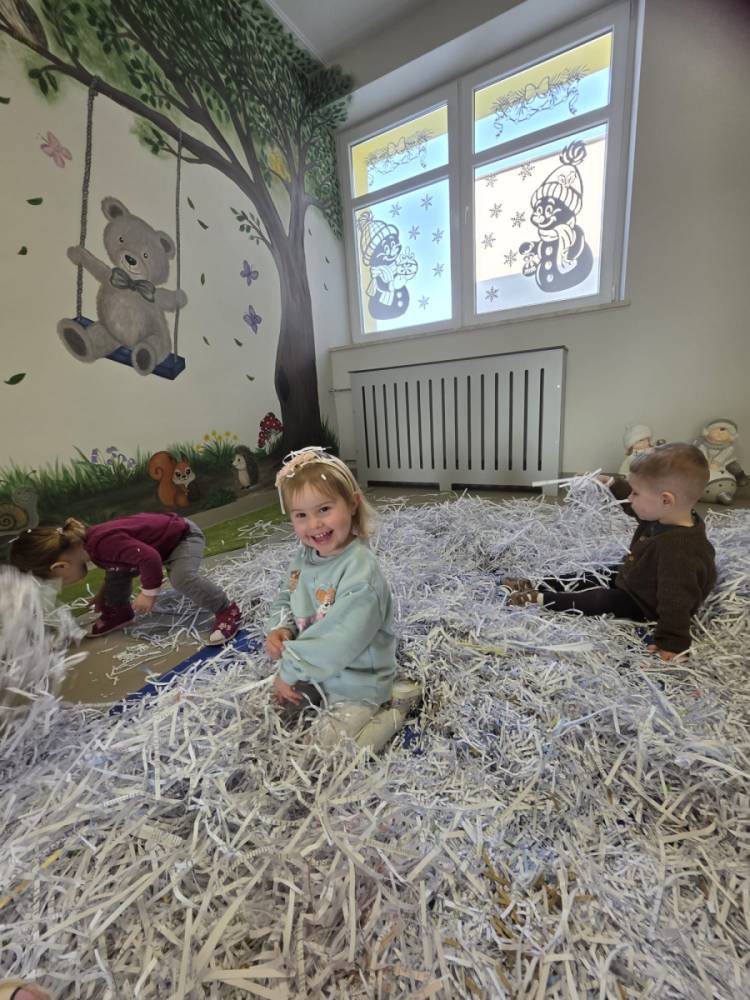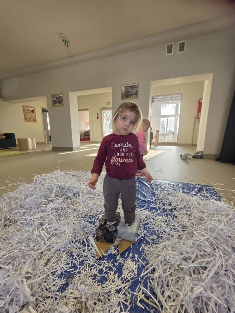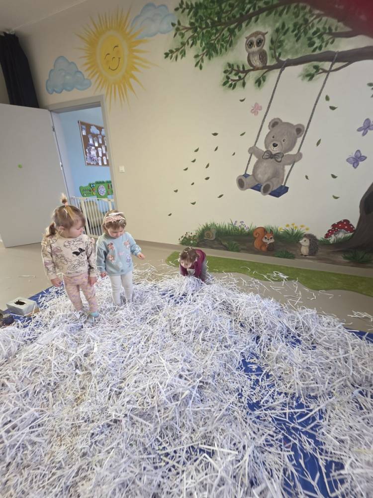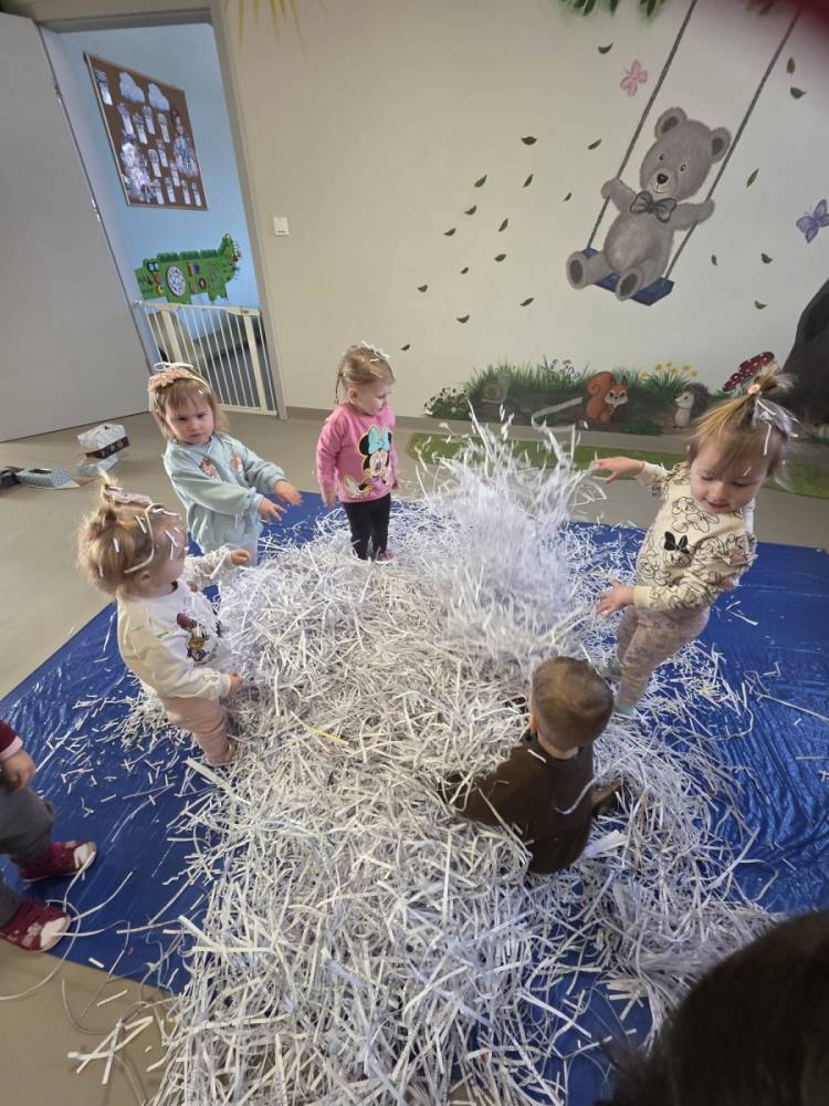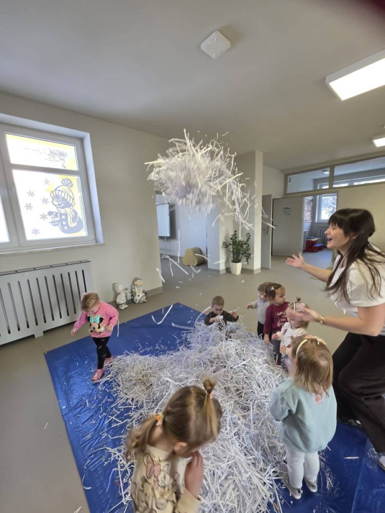 Zima w naszym żłobku trwa w najlepsze! ❄️☃️ Dziś nasze maluchy wybrały się na salę z własnoręcznie przygotowanymi nartami 🎿 – wykonanymi z pudełek po chusteczkach higienicznych i papieru z drukarki. Wystarczyła odrobina wyobraźni, by zwykła sala zamieniła się w prawdziwy, zimowy stok! Dzieci ćwiczyły równowagę, maszerowały dumnie w swoich „nartach” i nie szczędziły uśmiechów. Było dużo śmiechu, ruchu i kreatywnej zabawy. 💙