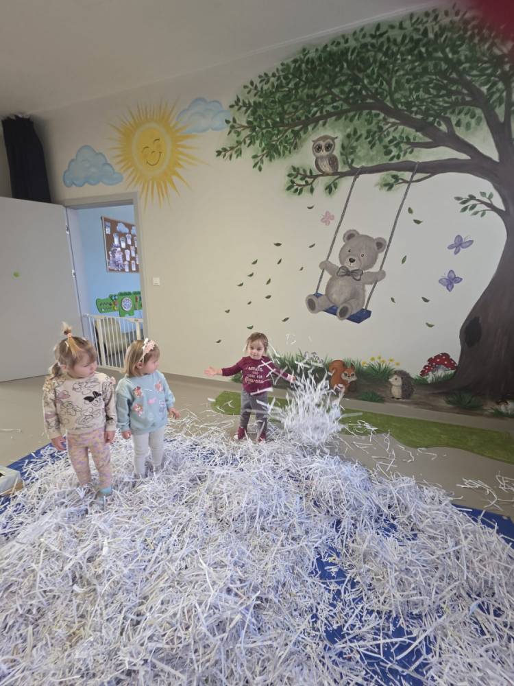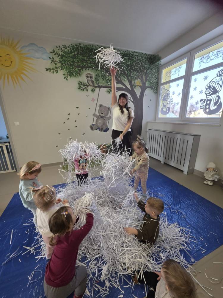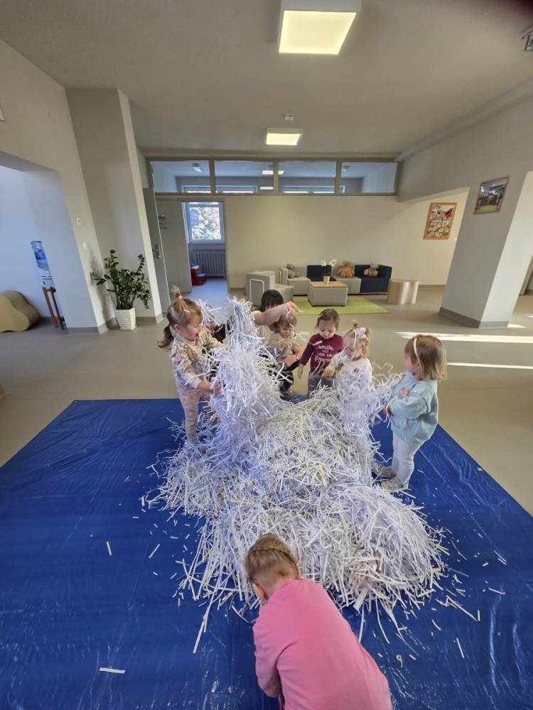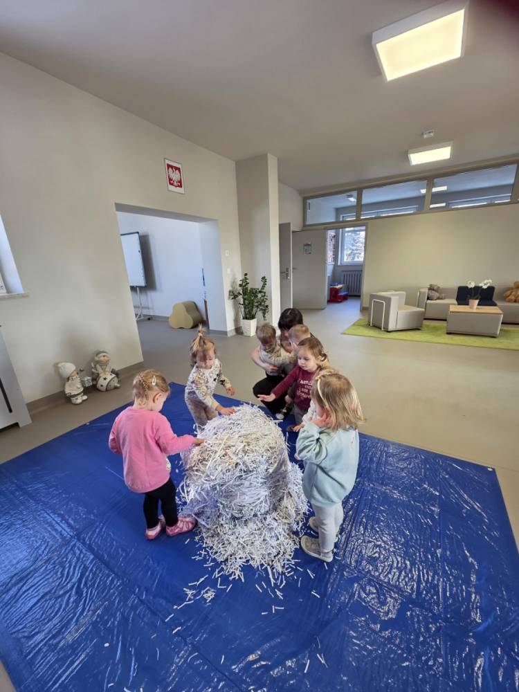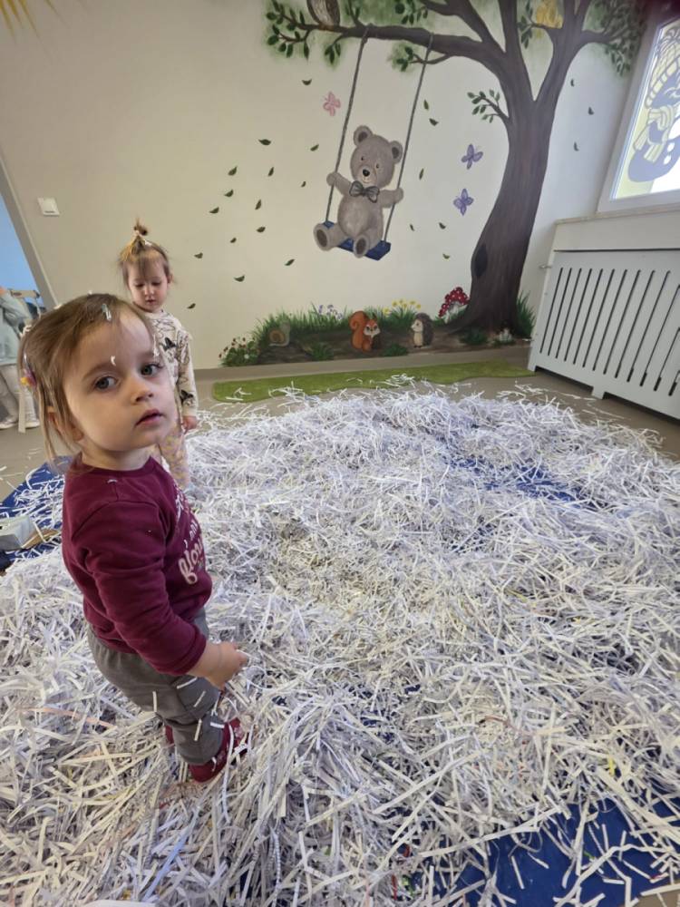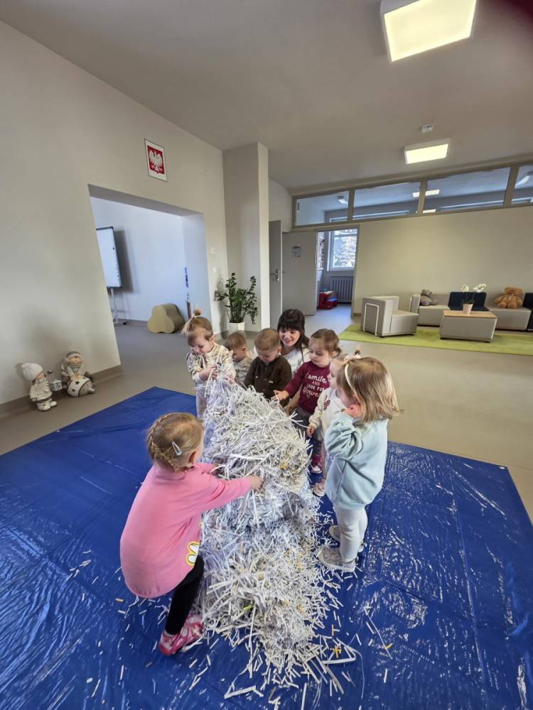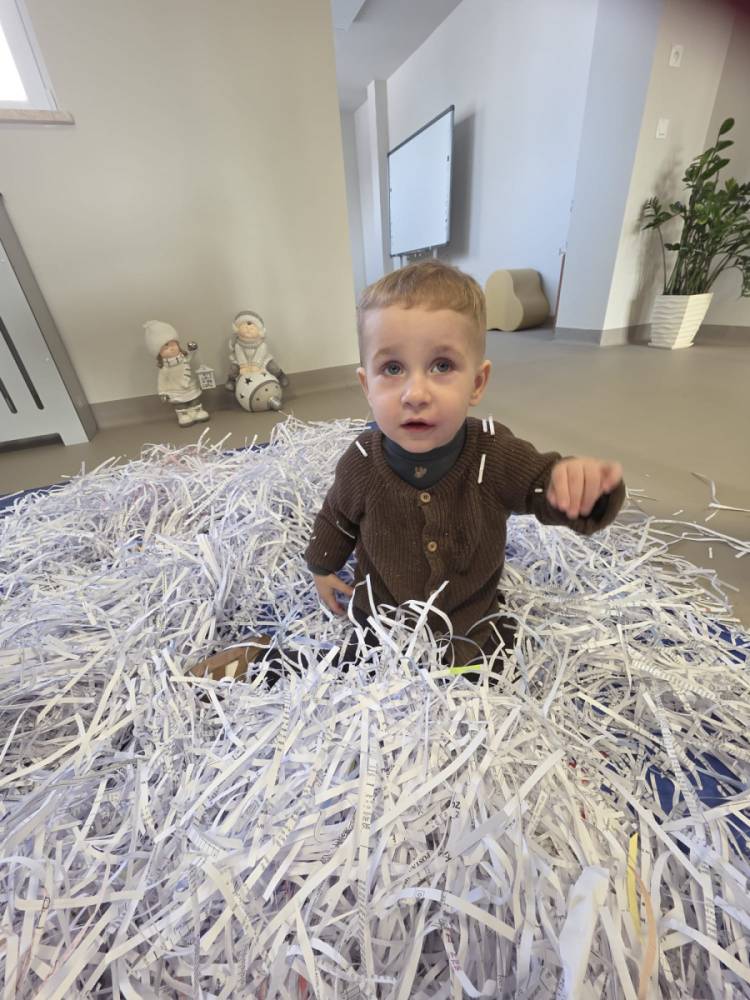 Zima w naszym żłobku trwa w najlepsze! ❄️☃️ Dziś nasze maluchy wybrały się na salę z własnoręcznie przygotowanymi nartami 🎿 – wykonanymi z pudełek po chusteczkach higienicznych i papieru z drukarki. Wystarczyła odrobina wyobraźni, by zwykła sala zamieniła się w prawdziwy, zimowy stok! Dzieci ćwiczyły równowagę, maszerowały dumnie w swoich „nartach” i nie szczędziły uśmiechów. Było dużo śmiechu, ruchu i kreatywnej zabawy. 💙